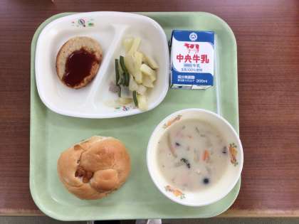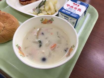 今日のスープは豆乳を使っています。ホワイトルウも小麦、乳を使用していない食物アレルギーに配慮したもので、みんなで楽しめる給食になっています。