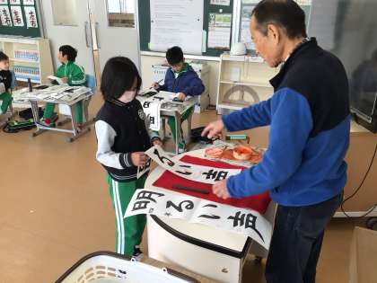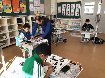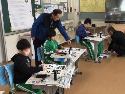 書写の講師の方をお招きして、3年生から6年生まで1時間ずつ書き初めの指導をしていただきました。書く時のポイントについて一人ひとり丁寧に教えてもらいました。