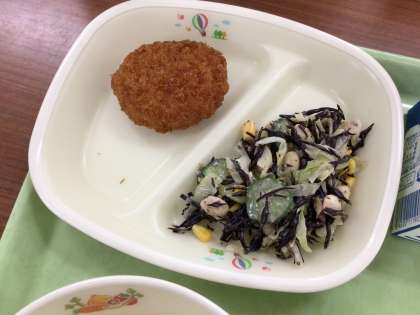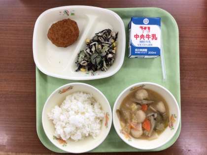 今日は月に一回の「豊田ブランドの日」です。豊田市産の食材を多く使用しています。ミンチカツには豊田市産のブランド豚である「ひまわりポーク」を使い、サラダや汁物には豊田市産や愛知県産の野菜を使用しています。地元の恵みに感謝しましょう。