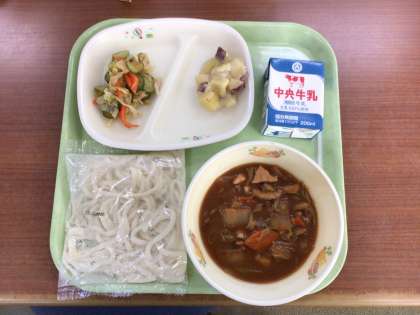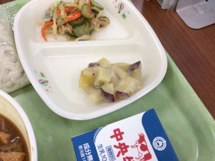 今日は愛知県の郷土料理である「みそ煮込みうどん」と「鬼まんじゅう」を組み合わせました。鬼まんじゅうはゴロゴロしたお芋が鬼のツノのように見えるからこの名前がついたと言われています。さつまいもとお砂糖の優しい甘さを味わって欲しいです。