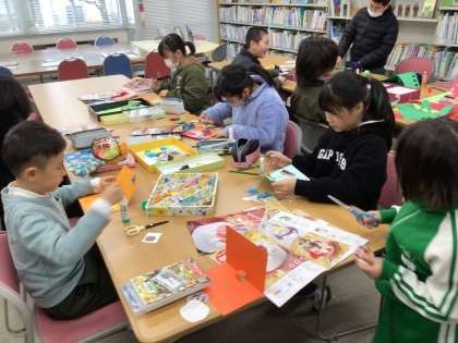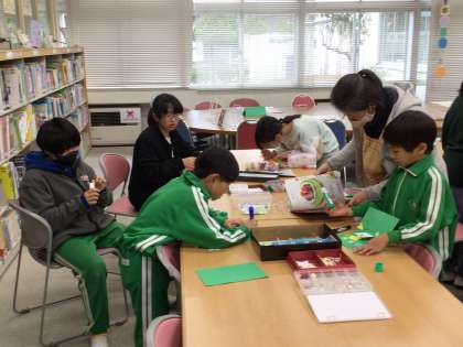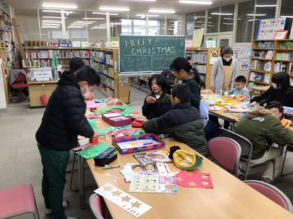 図書館で放課の時間、クリスマスカード作りを行いました。子ども達は思い思いにオリジナルのクリスマスカードを制作しました。