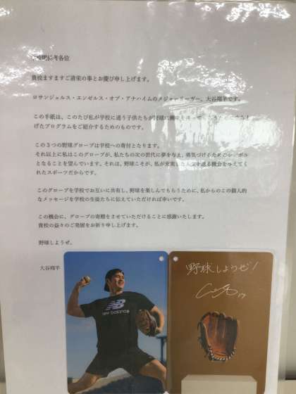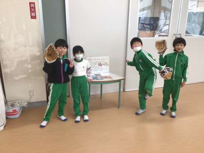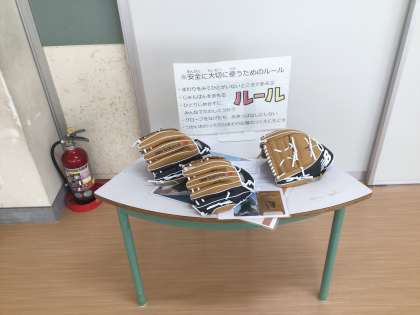 届いたグローブは、右利き用が2つと左利き用が1つです。1年生から順番に大谷選手のグローブをまわしていきます。6年生までまわったら、外でも使用して野球に親しめるように活用していきます。