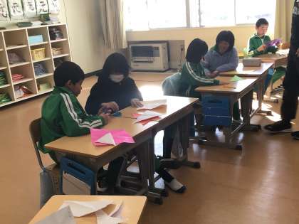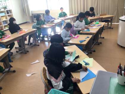 折り紙を使って、二等辺三角形や正三角形を作りました。折り紙をどうやって折れば出来上がるのか、考えることが難しかったです。