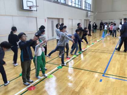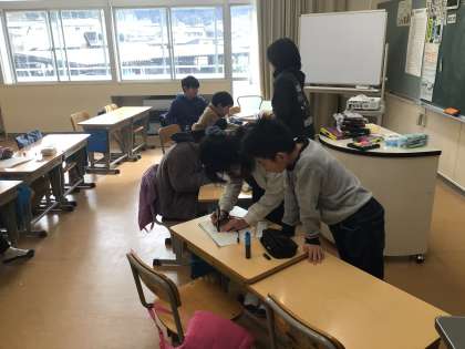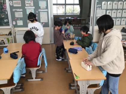 お昼の放課に、6年生が企画したプラとんぼ作りをしました。6年生に教えてもらいながらプラとんぼを作り、色を塗りました。その後、出来上がったプラとんぼを体育室で飛ばして遊びました。