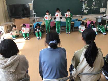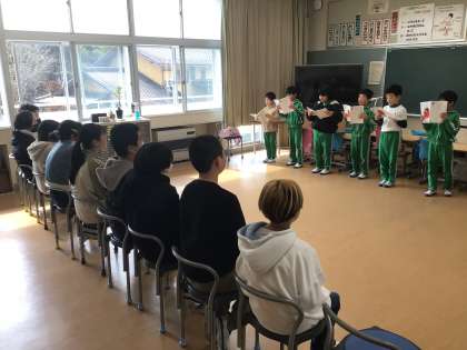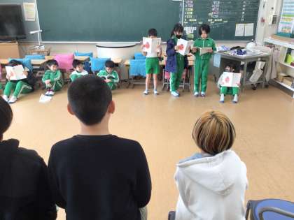 国語の「てがみ」の音読発表を6年生に聞いてもらいました。読み方が上手になっており、待っている姿勢もよく2年生の成長を感じました。6年生からも多くのお褒めのことばを聞くことができました。