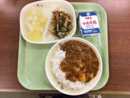 今日は1年生の国語の教科書に載っている「サラダでげんき」という物語から生まれた、りっちゃんの元気サラダです。野菜が苦手な子もこのサラダは残さず食べてくれることが多いです。