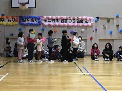 5年生が企画、運営の中心となって、6年生を送る会を行いました。各学年が6年生のために一生懸命に準備して、とても楽しく心温まる会になりました。