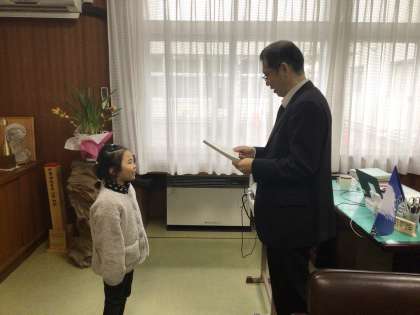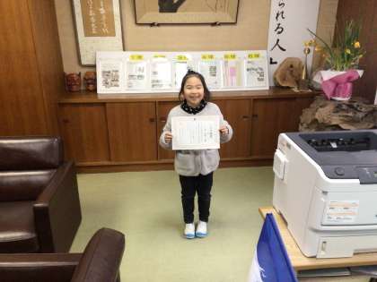 1年生の子どもにいなほ銀賞を渡しました。大きな声で挨拶することを頑張ったことがいなほ銀賞につながりました。