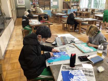 自分の好きなものを版画にしました。彫刻刀で丁寧に彫り進め、作品が完成に近づきました。