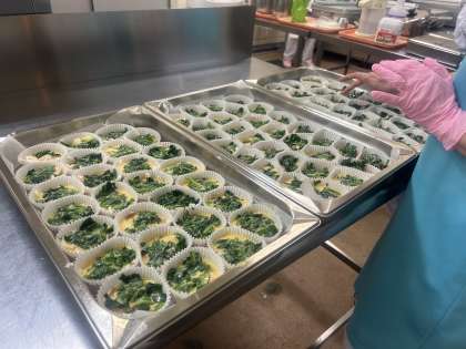 今日はキッシュをご紹介します。稲武給食センターではキッシュを手作りしています。キッシュは少しずつレシピを変更していて、今回は卵液の下にマッシュポテトをひいて食べ応えを出してみました。よりおいしくなるように改良を続けていきます。