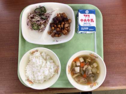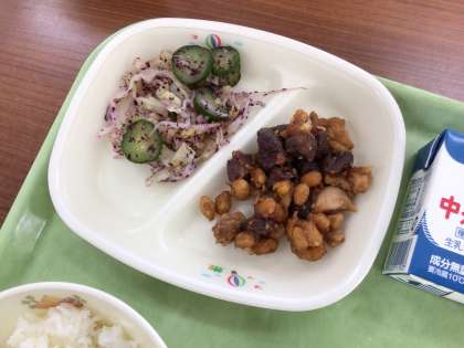 今日は月に一度のレバーの日です。今回はレバーと大豆をみそで甘辛く和えました。子どもたちは甘辛いみその味付けが好きで、みそ煮やみそ炒めなどは残さず食べてくれることが多いです。