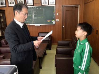 4年生の子どもにいなほ銀賞を渡しました。児童会選挙を頑張ったことがいなほ銀賞につながりました。