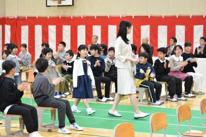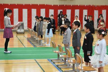 令和6年度入学式を行い、新1年生9名の入学を祝いました。入学認定での新1年生の子ども達の返事はとてもすばらしかったです。