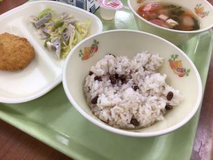 赤飯 いかの香味揚げ れんこんサラダ 花ふのすまし汁 お祝いプチゼリー