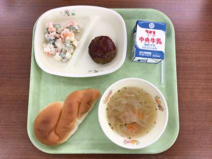 ツイストパン ハンバーグ ビーンズマセドアン オニオンスープ