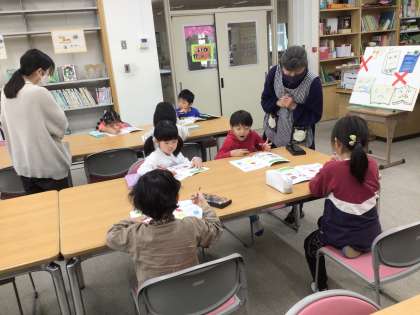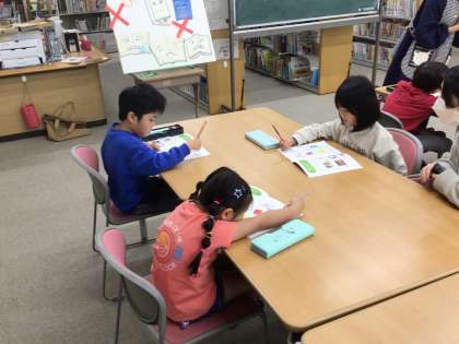 本と仲良く、本を大切にするための約束について、図書館司書の方から学びました。