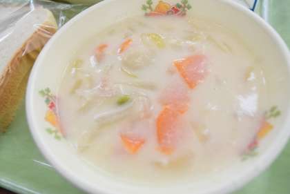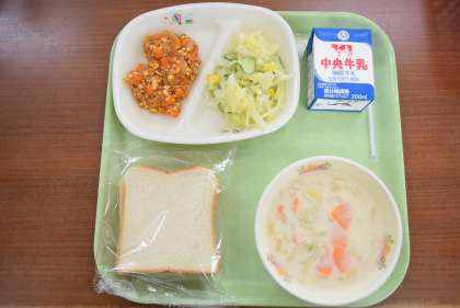 今日は3月にも使用した北海道産のホタテを「シーフードチャウダー」にしました。このホタテは国外に出荷ができなくなり、倉庫に余ってしまったものを使用しています。スープにホタテのうまみが染み出て、おいしく仕上がりました。