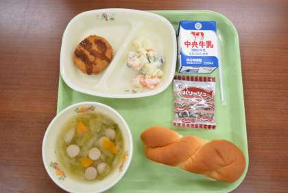 ツイストパン キャベツ入りミンチカツ ポテトサラダ レタススープ