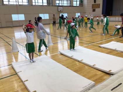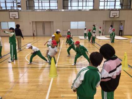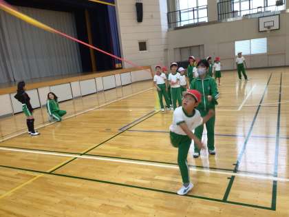 体力テストに向けて、子ども達が運動する機会を増やすためにスポーツ委員会が中心となって運動できる場所作りや呼びかけを行っています。今日は雨だったので体育室で立ち幅跳びやソフトボール投げの練習などをしました。