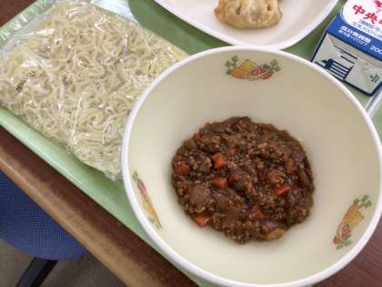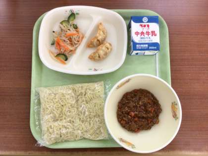 今日の「ジャージャー麺」はたべまるのおすすめです。「ジャージャー麺」は中国発祥の料理で、肉みそと麺を絡めて食べます。甘みと、唐辛子の少しの辛味あり、箸が進みます。