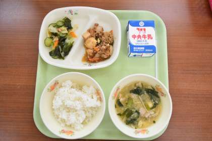 今日は中華献立です。常家豆腐(ジャーチャンドウフ)は中国の家庭料理で、様々な食材と生揚げを一緒に炒めて作ります。給食では玉ねぎ、にんじん、ねぎなどたくさんの野菜を使いました。