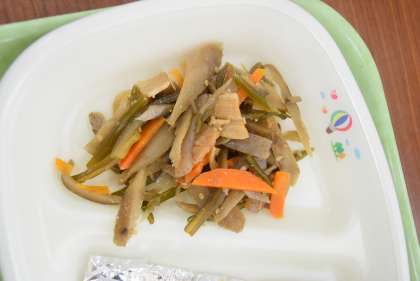 今日のかみかみ献立は「茎わかめのきんぴら」です。茎わかめはその名の通り、わかめの茎の部分です。茎わかめはこりこりとした独特の噛み応えがあります。噛むのを楽しみながら、1口20回を目安によく噛んで食べましょう。