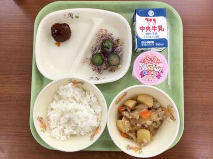 ごはん 肉だんご ゆかりあえ 肉じゃが いちごゼリー