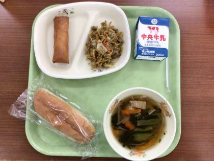 米粉パン 青じそ入り春巻き やきそば 五目スープ