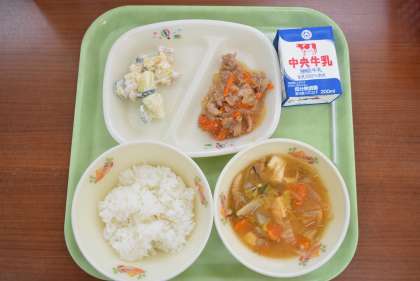 今日は市内統一献立「愛知を食べる学校給食の日」です。これは愛知県全体での取り組みで、各市町村の各学校で、地元の食材を使った給食を実施しています。豊田市では、豊田市のブランド豚であるひまわりポークを使用したしょうが炒め、市内産の大豆「フクユタカ」を使ったサラダ、市内産のはくさいを加工したキムチを使用したキムチ入りみそ汁を献立に盛り込みました。子供たちが地元のおいしいものを楽しめたらいいなと思います。