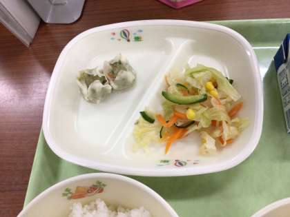 今日は中華献立です。野菜入りしゅうまいには、にんじん、ほうれんそう、とうもろこしなどの野菜が入っています。しゅうまいは好きな子が多いので、野菜を美味しく食べてくれたらいいなと思います。
