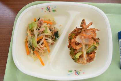今日は夏が旬の野菜「ゴーヤ」を使用したかき揚げです。苦手な子が多いゴーヤですが、少しでも子ども達に食べてもらうために、メニューを考えました。子ども達の反応が楽しみです。