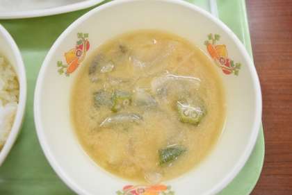 今日は夏が旬の野菜を使用した献立です。甘辛煮にはかぼちゃを、サラダには枝豆ととうもろこし、ごまみそ汁にはじゃがいも、玉ねぎ、オクラ、なすを使用しています。旬のおいしさを味わってほしいです。