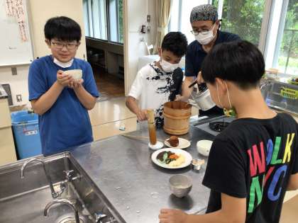 講師の方を招いて、稲武の桶茶について学びました。子ども達は茶桶で泡立てたお茶をお漬け物と一緒に味わいました。