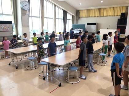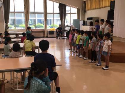 低学年、中学年、高学年にわかれて今月の歌を歌い聴き合いました。