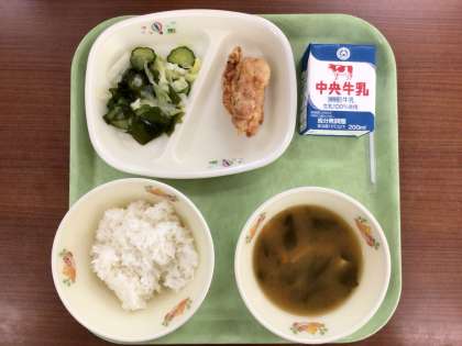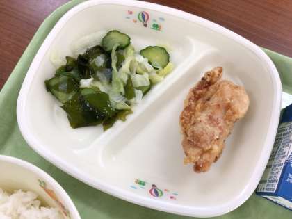 ごはん とり肉の塩から揚げ わかめの酢の物 モロヘイヤのみそ汁