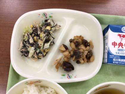 今日は月に一度のレバーの日です。今日はレバーと大豆の甘辛煮にしました。甘辛い味付けで鶏肉を炒め、そこにそれぞれ上げたレバーと大豆を入れていきます。衣に味が染み込み、ごはんが進む味付けです。