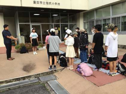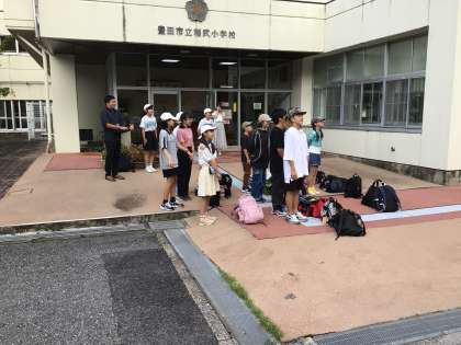 6年生は全員元気に登校して、出発式を行いました。バスに乗り込み今から出発します。