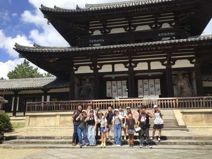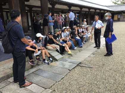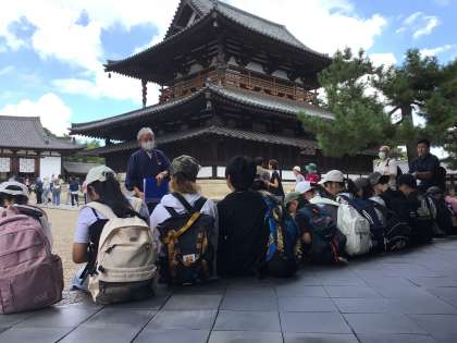 法隆寺の見学をしました。天気がよく、汗をかきながらの見学になりましたが、世界最古の木造建築の五重塔と金堂など、見学することができました。