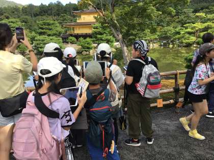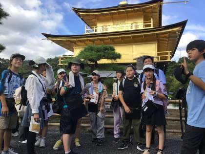 金閣寺を参拝しました。開門から長蛇の列ですごい人でしたが、ひかり輝く金閣寺を近くで見ることができました。