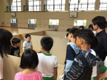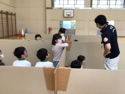 豊田市防災対策課の方に、避難場所について教えていただきました。その後、避難所の間仕切りや簡易トイレを作り、避難所での生活について知ることができました。