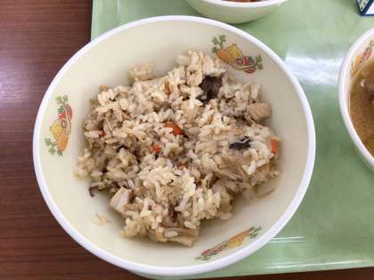 今日は豊田市統一献立の「秋の味覚」献立です。秋に旬を迎える食材を多く使用しました。きのこごはんには「しいたけ、しめじ、えのきたけ」の3種類のきのこを入れました。きのこのうまみがたっぷりの味ごはんになりました。