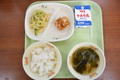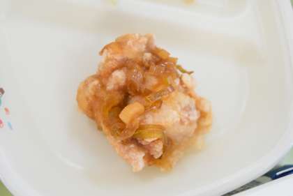 今日の「とり肉の香味ソースかけ」は、たべまるのおすすめです。「たべまる給食」と検索するとレシピを見ることができます。甘酸っぱいタレがごはんによく合います。