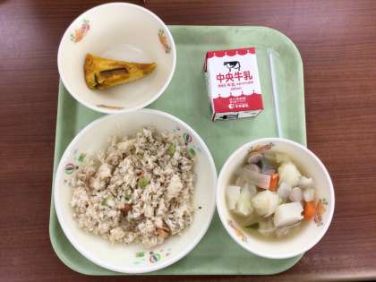 今日はエビピラフにしました。給食で使用するエビは料理によって大きさを変えています。今日のピラフには食べやすいように、小ぶりのエビを選びました。エビの味がごはんに染みて、おいしいピラフができたと思います。