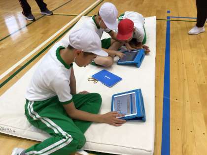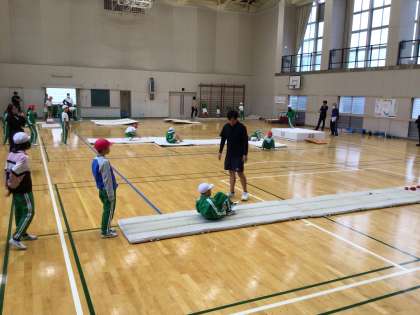 3年生4年生が、いろいろな転がり方を見つけたり、動きや練習の仕方を工夫したりして、マット運動を楽しんでいます。今日は前転じゃんけんに挑戦しました。「勢いよく回る」、「手をついて押す」など、上手に前転じゃんけんができるこつを見つけ出しました。