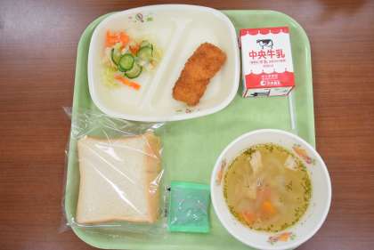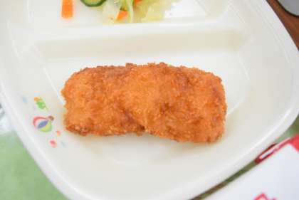 今日はいかフライのレモンソースかけです。このフライは衣がザクザクで噛み応えがあり、いかも弾力が強く、よく噛まなくてはいけない「かみかみメニュー」です。健康な歯と、強い顎を育てるために、よく噛むように指導していきます。