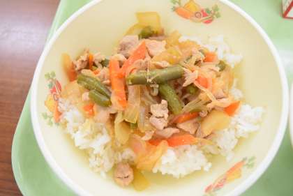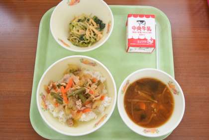 今日は豚丼にしました。豚丼には、豚肉の他にもたまねぎ、にんじん、さやいんげんが入っていて野菜も多く摂取することができます。