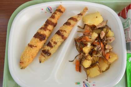 今日はししゃもフライです。ししゃもは頭からしっぽまですべて食べることができるので、多くのカルシウムを摂取することができます。よく噛んで残さず食べてほしいです。