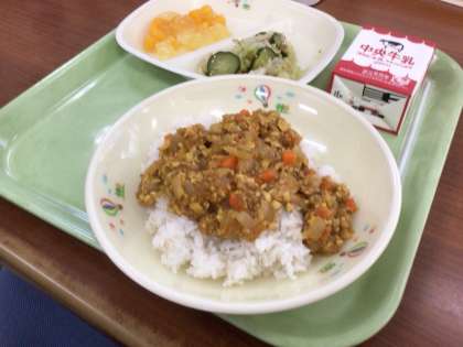 今日はドライカレーにしました。ひき肉やにんじんがコロコロ入っています。カレールウを使わず、カレースパイスで味を付けました。