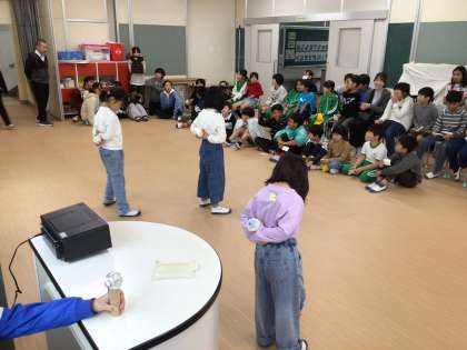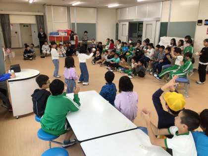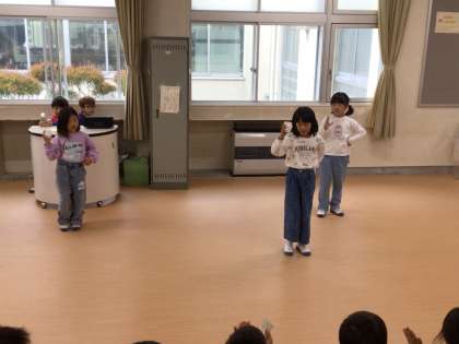 1年生の有志の子どもたちが、放課にダンスを披露しました。見ている子どもたちは、かわいいダンスを見て、とても盛り上がりました。