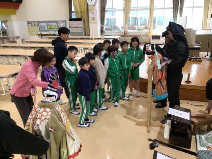人形劇終了後、人形の仕組みについて教えてもらいました。子どもたちは、目や眉毛が動いたり、口が動いたりする人形の仕組みを知って驚きました。